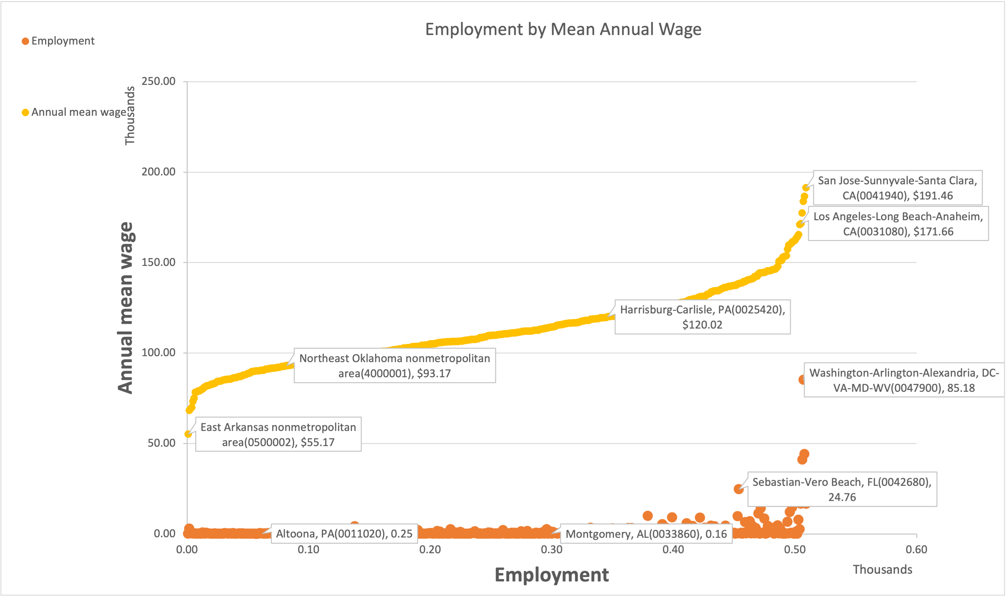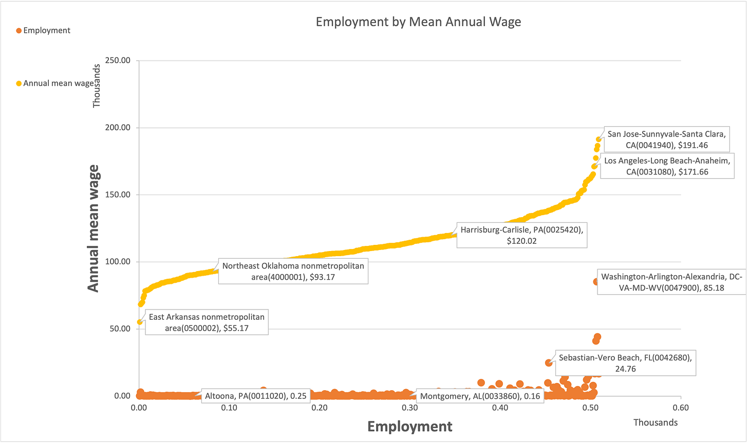 I took all the regions and split them by metro and non-metro areas. Then I looked at the average mean of wages from May 2021 (the latest) and employment in those offices, using a scatterplot to see where they landed and to see if there was a relationship. It looks like bigger urban areas have higher pay and more employees, which is expected. But there are still pretty staggering numbers to consider.